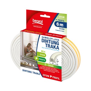 Samolepljiva dihtung guma u beloj i braon boji P profila.